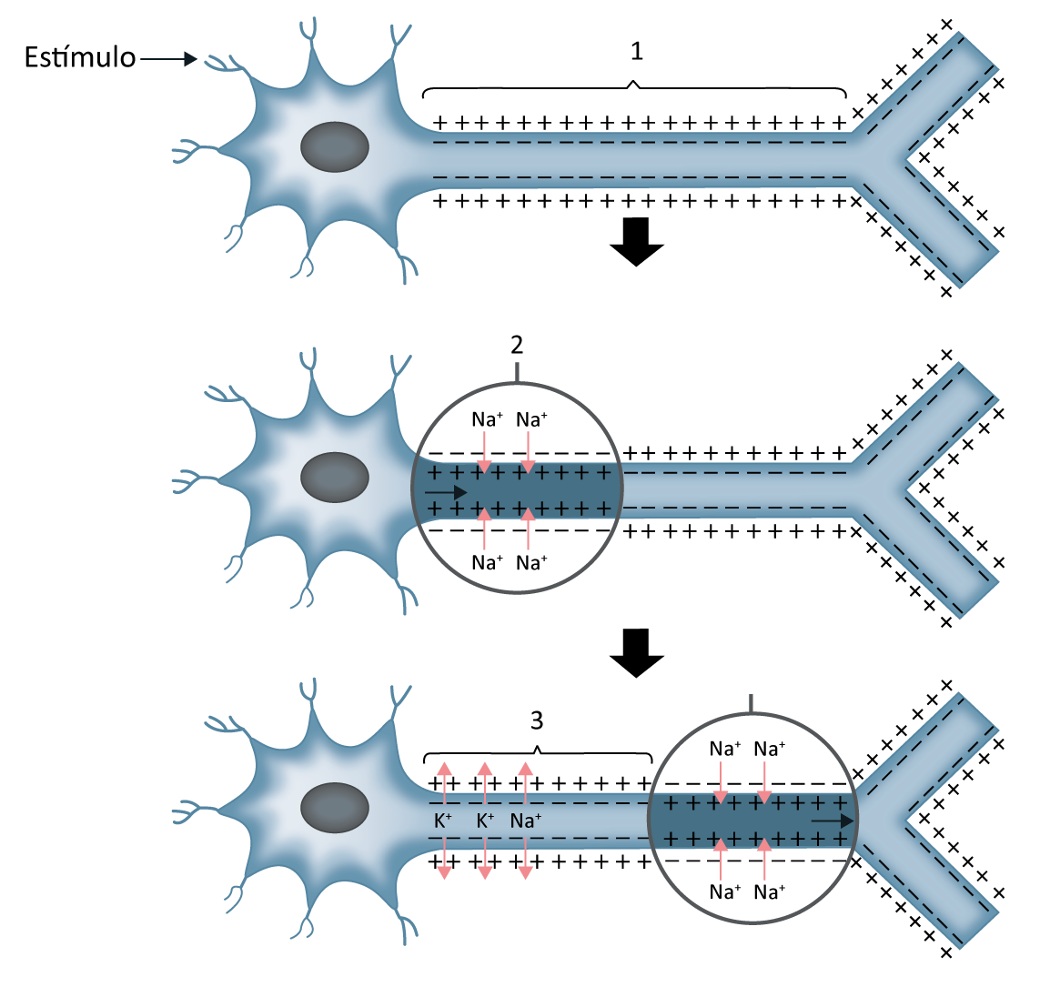 Esse estado é mantido por uma diferença de concentração de dois íons, entre os lados interno e externo da membrana plasmática, o sódio \((N{{a}^{+}})\) e o potássio \(({K^{+}})\). Em repouso, bombas de \(N{{a}^{+}}/{{K}^{+}}\) transportam ativamente três íons \(N{{a}^{+}}\) para o meio externo e dois íons \({K^{+}}\) para o meio interno. Os íons \(N{{a}^{+}}\) têm dificuldade de entrar na célula, pois a membrana está pouco permeável a eles.